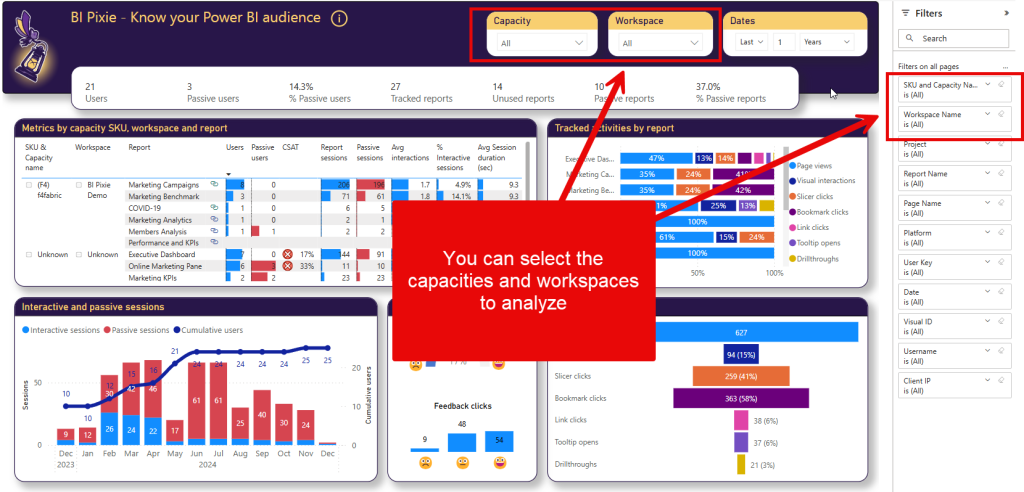 This month (December 2024 release), we expanded BI Pixie capabilities to aggregate engagement data at the Capacity and Workspace levels. BI Pixie can now read meta-information from your Microsoft Fabric or Power BI service and allow you to analyze the effectiveness of your reports by capacities and workspaces.