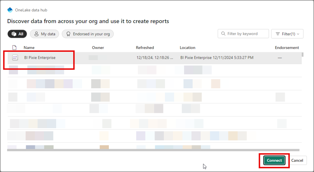 In the OneLake data hub, select BI Pixie Enterprise, and click Connect.