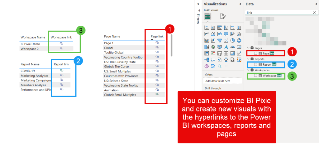 You can customize BI Pixie report and use the Page link, Report link and Workspace link as highlighted below to create your own experiences with navigations to workspaces, reports and pages.