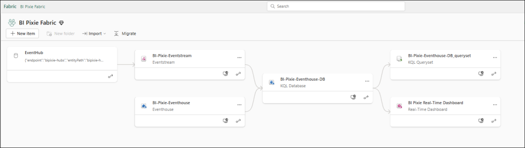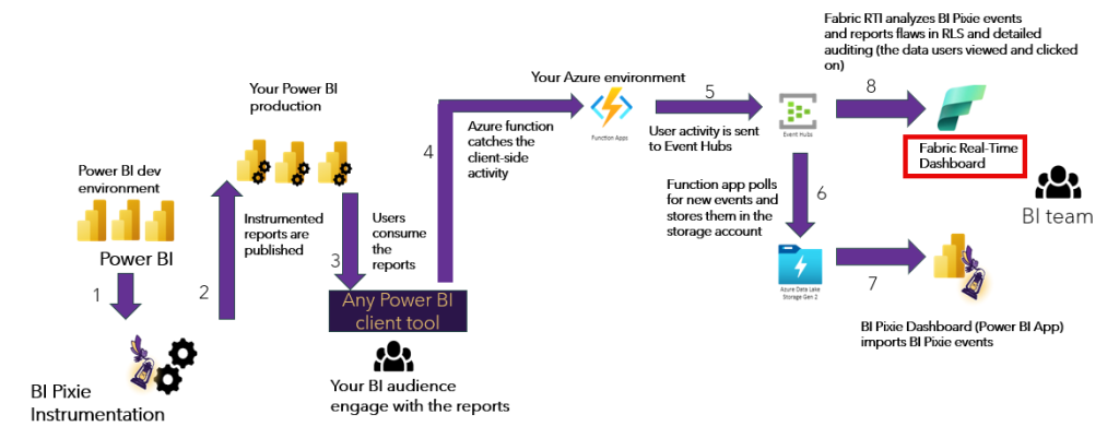 In the flow diagram below, you can find the components of BI Pixie and where they integrate with Fabric Real-Time Intelligence (RTI).