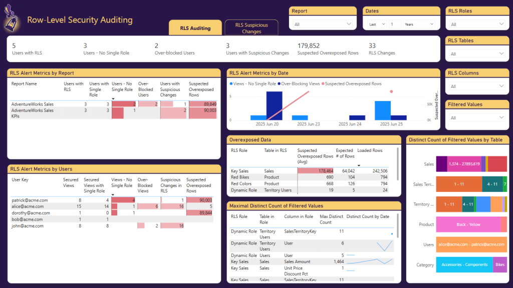 In RLS Auditing page (1st tab), you have a break down of RLS alert metrics by report, user and date. Learn where and when large volumes of data are unintentionally visible due to weak RLS configurations. Supporting insights include overexposed row counts, filtered value distributions, and detailed metrics by table and role—empowering admins to pinpoint and remediate critical access issues quickly.