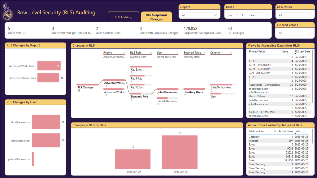 - Users with Suspicious Changes Users who have experienced recent, unexpected changes in RLS assignments or accessible data values, suggesting a need for closer review.