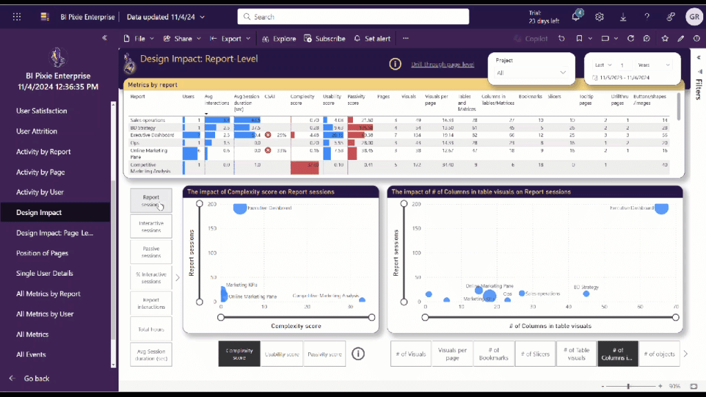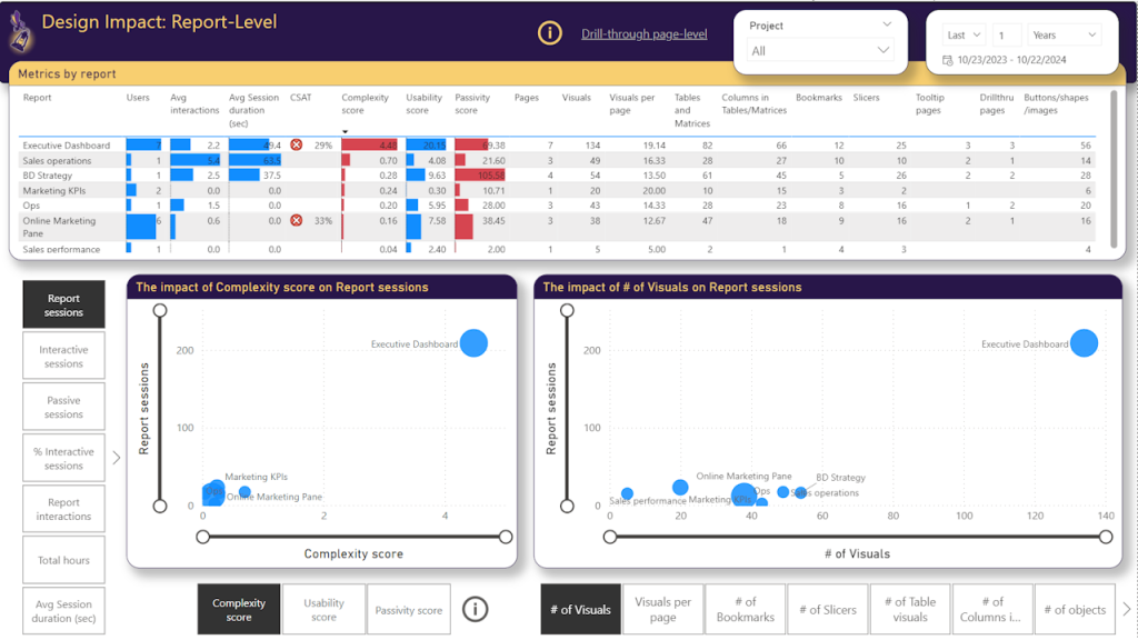 In the BI Pixie app, you can now find two new pages to help you answer such questions. In the Design Impact page, you can analyze the effectiveness of your report design at the report level using three new scores that assess report complexity, usability, and passivity. With these scores and their underlying measures, you can identify ineffective design patterns in your reports.