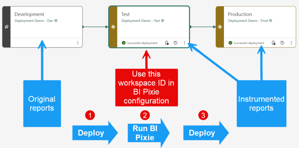 include_workspace_idsin your config. Optionally specify particular report IDs. - When changes in Development are ready, deploy to Test (Step 1 in the diagram).
