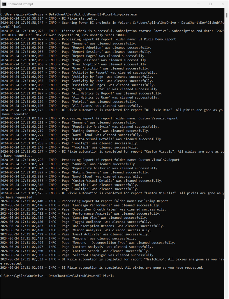 Each consecutive run of 'bi-pixie.exe' will clean the Power BI report files from the pixies of the previous run and will add new pixies to reflect the new report definitions. New logs will be appended to the log files above.