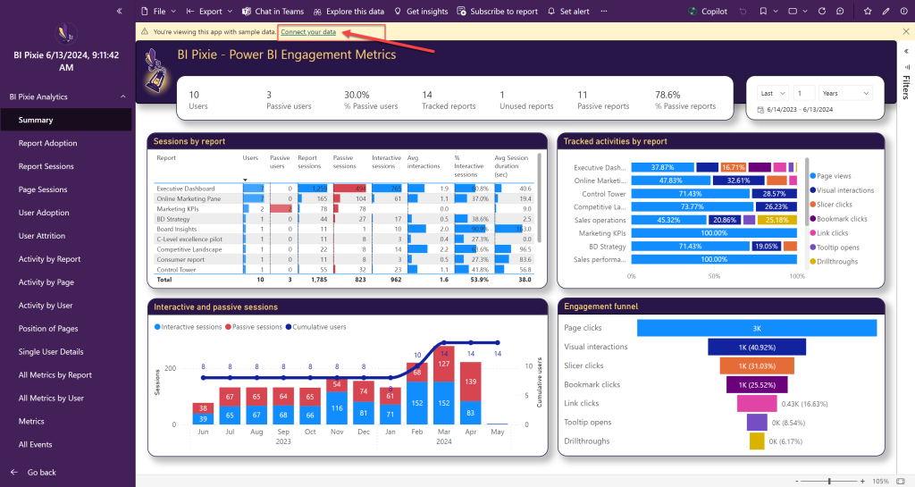 In this section, you will learn how to set up BI Pixie Dashboard to connect to the data that BI Pixie collects and allow you to analyze your Power BI reports through the lens of adoption, engagement, user satisfaction, business outcome, performance and security.