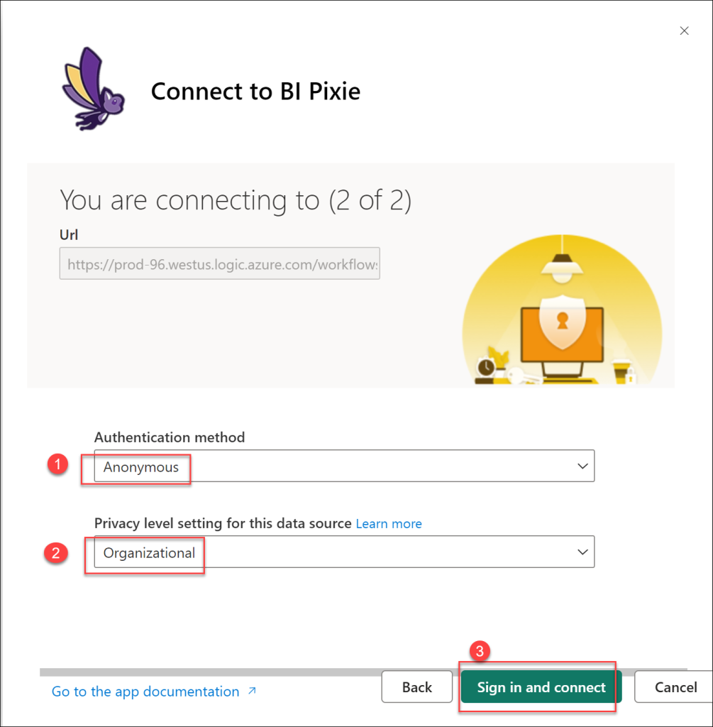 In the next page, make sure that Anonymous is selected as Authentication method, and that Organizational is selected as Privacy level setting for this data source. Then, click Sign in and connect.