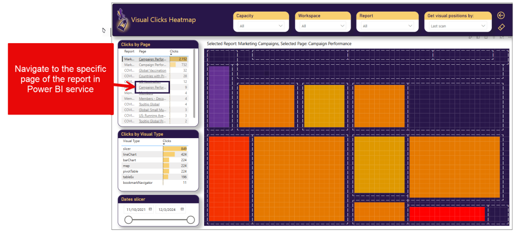 When relevant, the navigation to Power BI service is available in BI Pixie at the page level. For example, in the new Heatmap page, you can select a specific low-performing page by clicking the Clicks cell in Clicks by Page table. Then, after you review the heatmap to understand which visuals get low numbers of clicks, you can click the hyperlink as highlighted below to open the specific Power BI report page and continue the investigation.