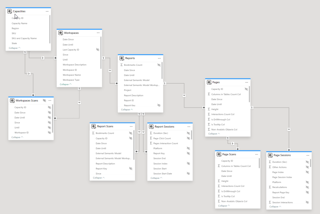 In the Model view, you can learn how Capacities, Workspaces, Reports and Pages are connected, and then go to Report view to create new visuals that analyze engagement, adoption, attrition or user satisfaction at different levels from Capacities and Workspaces to the Reports, Pages and Visuals.