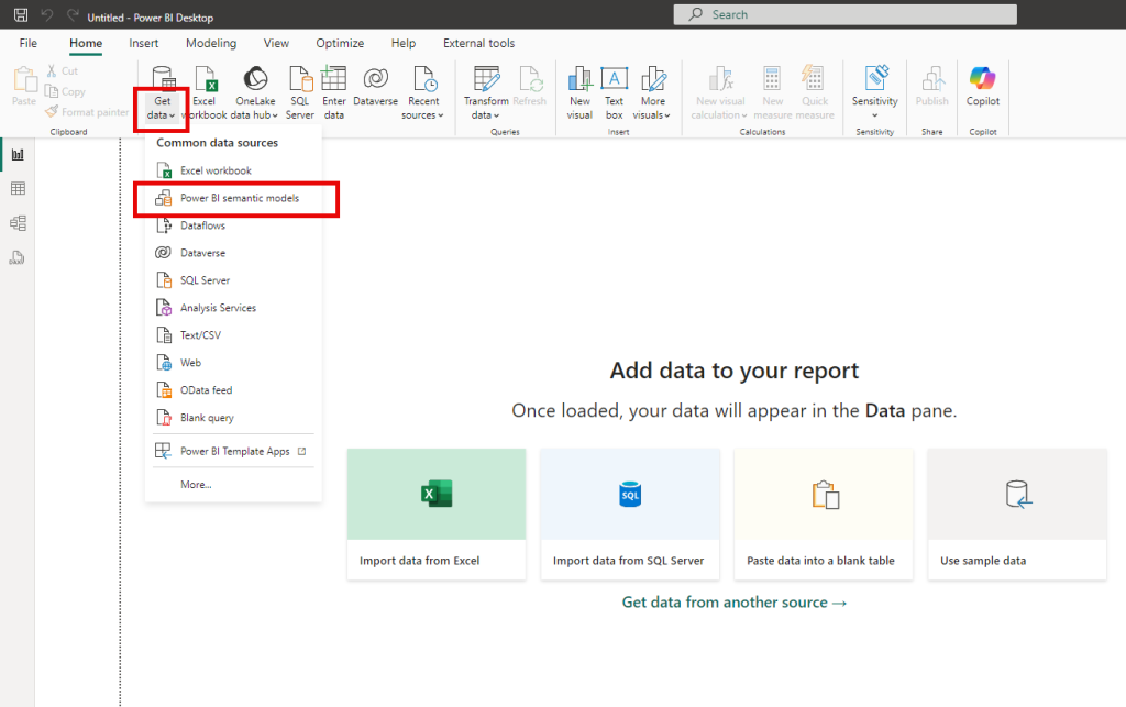 To connect to the semantic model, select Get data and then Power BI semantic models.