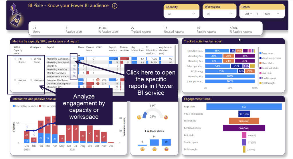 This month (December 2024 release), we expanded BI Pixie capabilities to aggregate engagement data at the Capacity and Workspace levels. BI Pixie can now read meta-information from your Microsoft Fabric or Power BI service and allow you to analyze the effectiveness of your reports by capacities and workspaces.