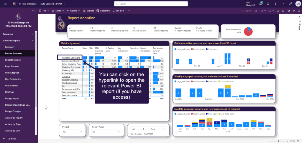 In some cases, we incorporated the hyperlinks in the report names. For example, in Report Adoption page, you can find the reports with the highest engagement. If you are curious why these reports get the highest engagement, just click the report name as highlighted below to navigate to the reports and get some ideas how they were designed.