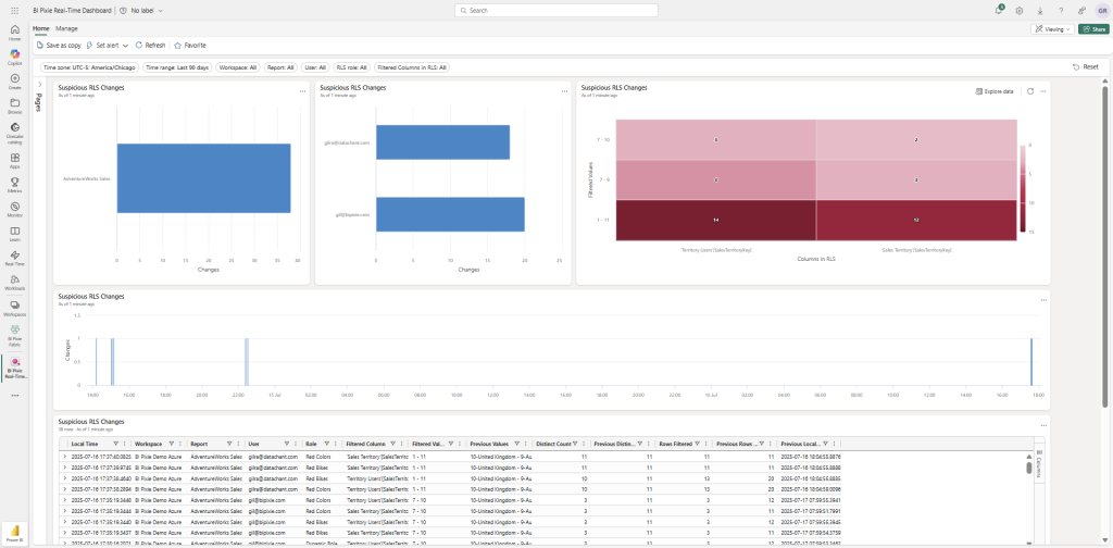RLS events are detected in real-time as your end-users open your Power BI reports. But using BI Pixie Dashboard, you can only analyze alerts after the next refresh of BI Pixie’s Semantic Model. If you need real-time monitoring of the RLS alerts, you can use our new integration with Microsoft Fabric RTI. Starting from this month (August 2025), you can deploy BI Pixie on Fabric Real-Time Intelligence (RTI) to monitor RLS in real-time and escalate it as suspicious leaks are detected.