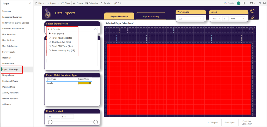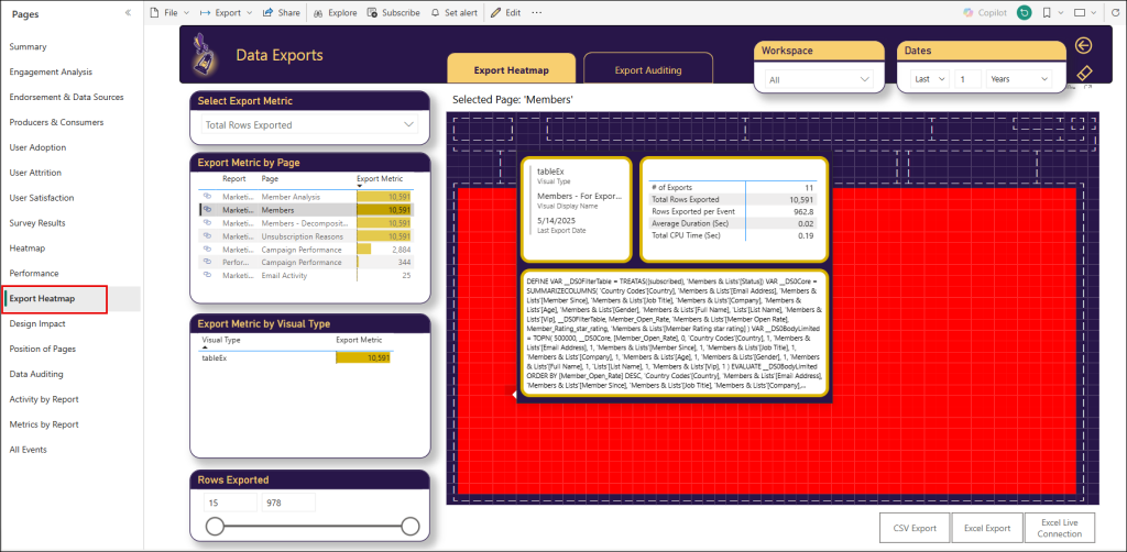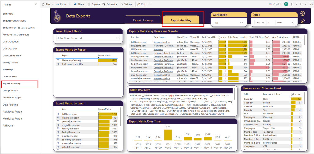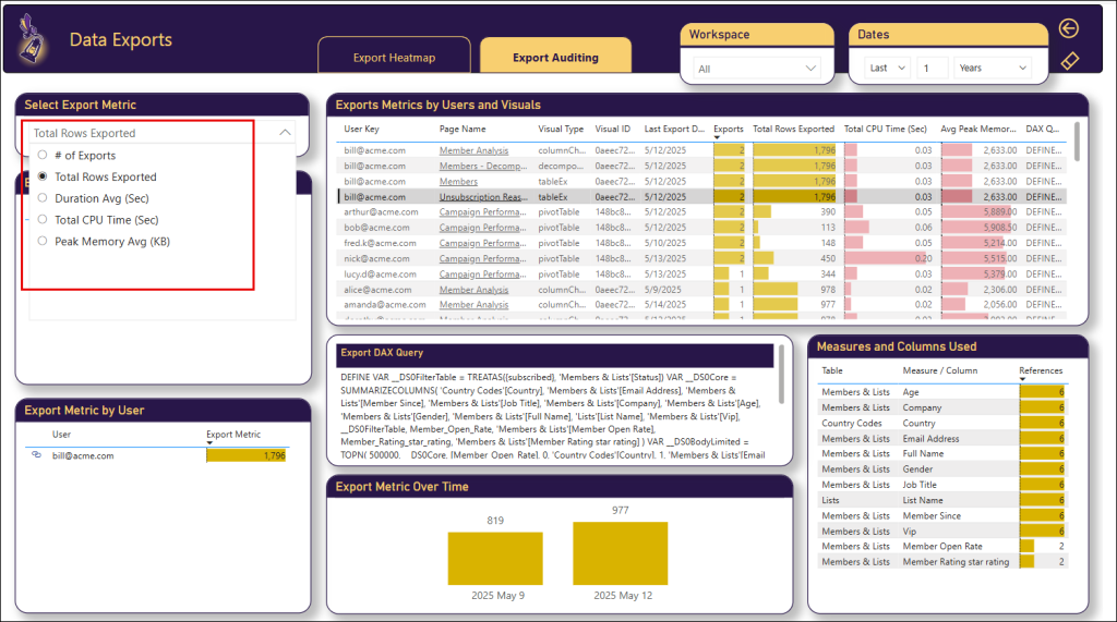 In the Export Auditing tab (that is available from the Export Heatmap page), you can analyze the export events in more details. including top exporters and visuals. When you select an individual export event at top table, you can find the specific DAX query and the specific measures and columns that were exported.