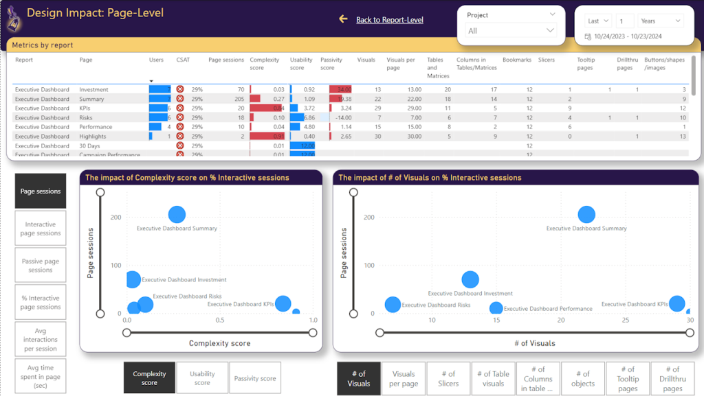 In the BI Pixie app, you can now find two new pages to help you answer such questions. In the Design Impact page, you can analyze the effectiveness of your report design at the report level using three new scores that assess report complexity, usability, and passivity. With these scores and their underlying measures, you can identify ineffective design patterns in your reports.