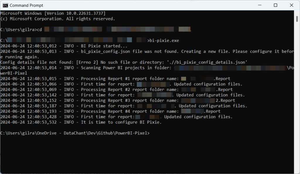 bi-pixie.exe [target folder path] Here is an output of the first run when 'bi-pixie.exe' is located in the same folder as the Power BI project files. In the screenshot below, there are four reports in the folder, and 'bi-pixie.exe' returns descriptive output after the first run.
