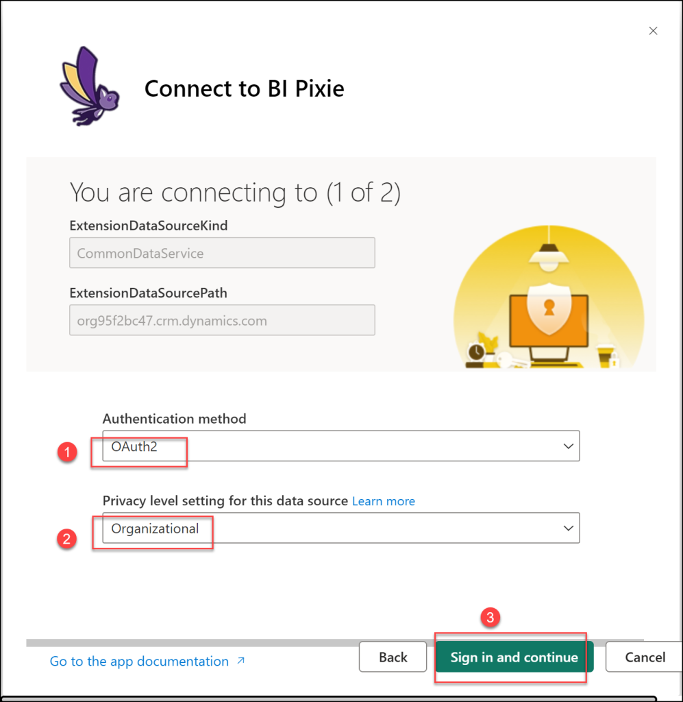 In the next page, make sure that OAuth2 is selected as Authentication method, and that Organizational is selected as Privacy level setting for this data source. Then, click Sign in and continue.