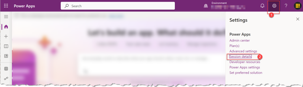 Click the gear icon at the top right side of Power Apps page and select Session details.