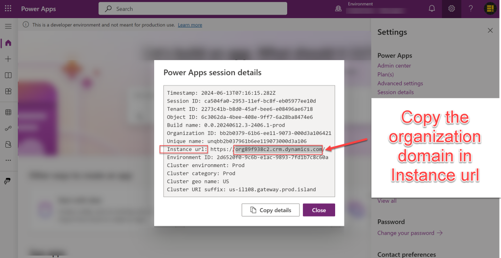 Find the Instance url line and copy the organization domain that is highlighted below. The organization domain should not include the https:// prefix or the last /. Copy only the part with the format org*.crm.dynamics.com