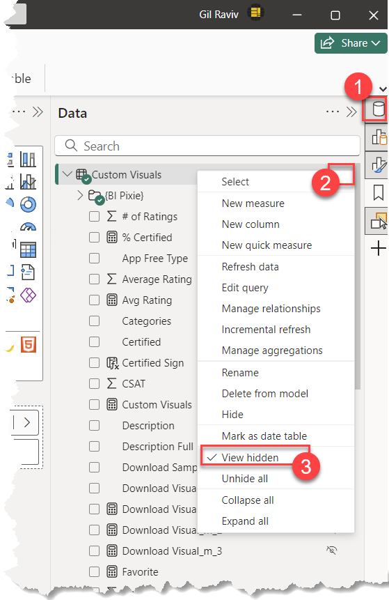 Open the Data right pane, and click the ellipsis of the first table. In the drop-down menu, select View hidden.