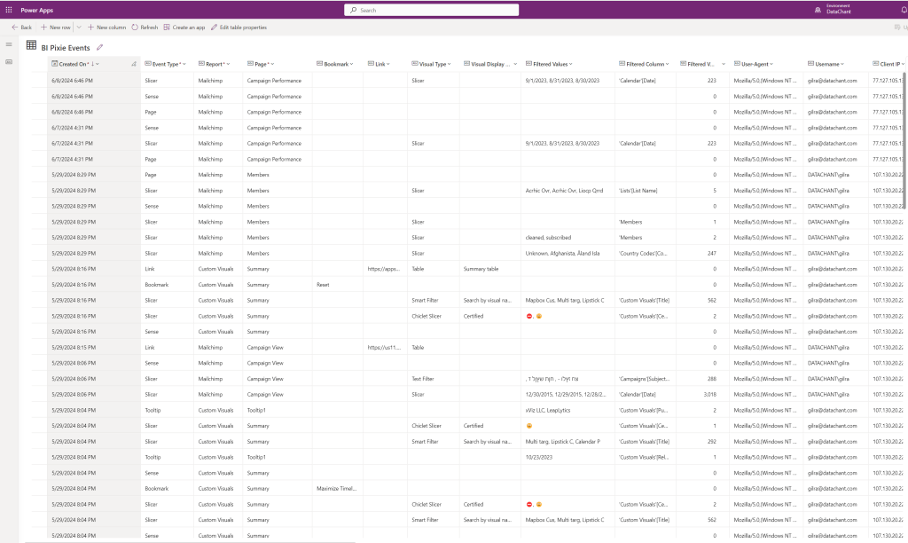 If you see the events in BI Pixie Events table, you can now test if the events are tracked when the report is consumed in Power BI service. Publish the instrumented report to the Power BI service and open the report in its workspace. Navigate through the pages and interact with the visuals, slicers and bookmarks. Check the BI Pixie Events table and confirm you see new events. This time, the events will include your email address in Username column.