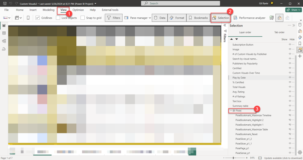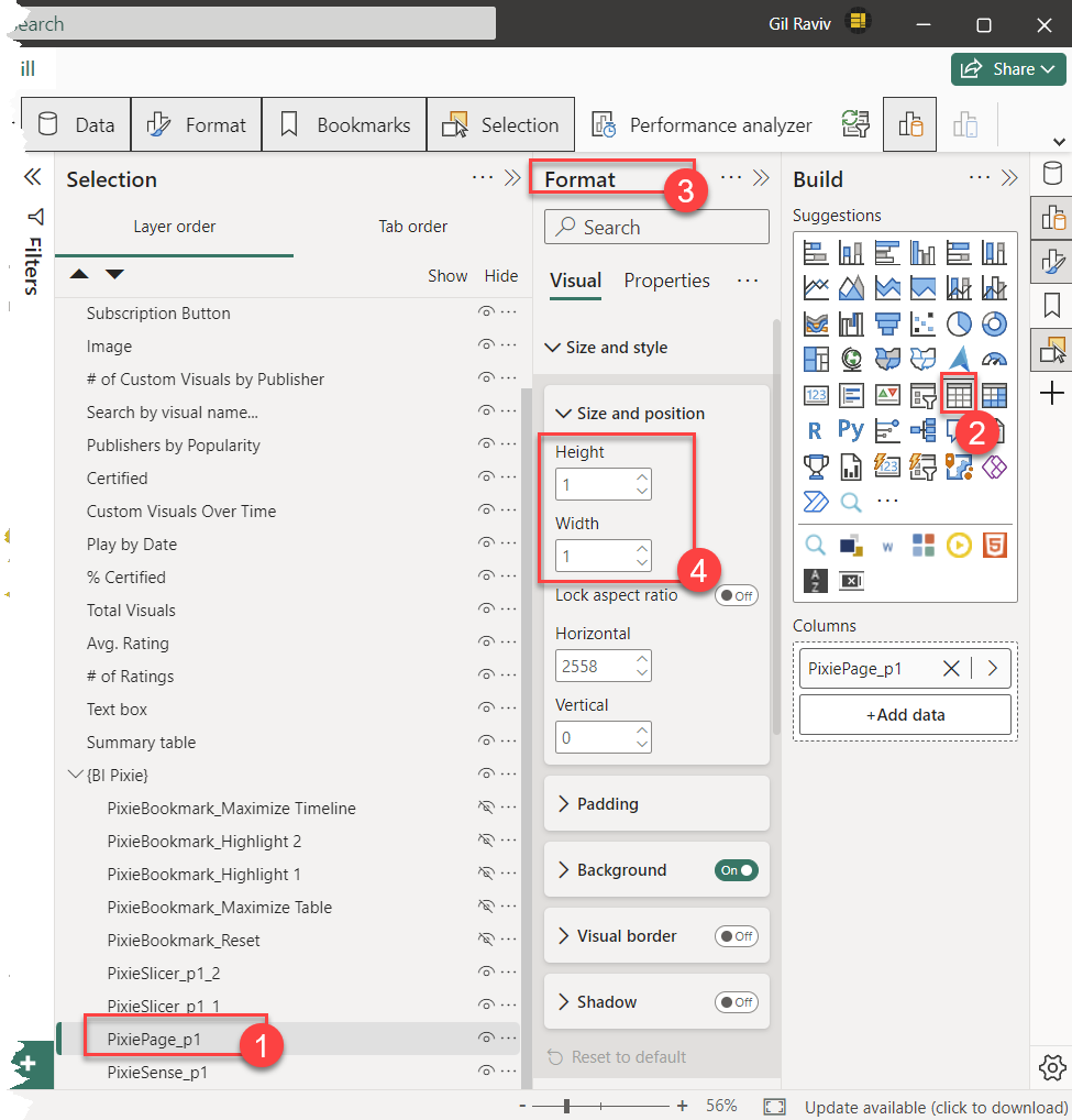 Select one of the visuals under {BI Pixie} group. You can now open the Build pane to see that the visual is a table visual. In the Format pane under Visual tab, expand the Size and position. You can now see that the visual's width and height are set as 1 pixel.
